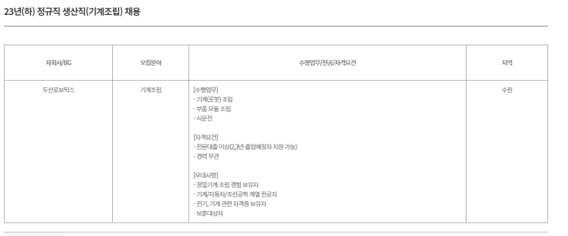 두산로보틱스 생산직(조립) 직무 소개