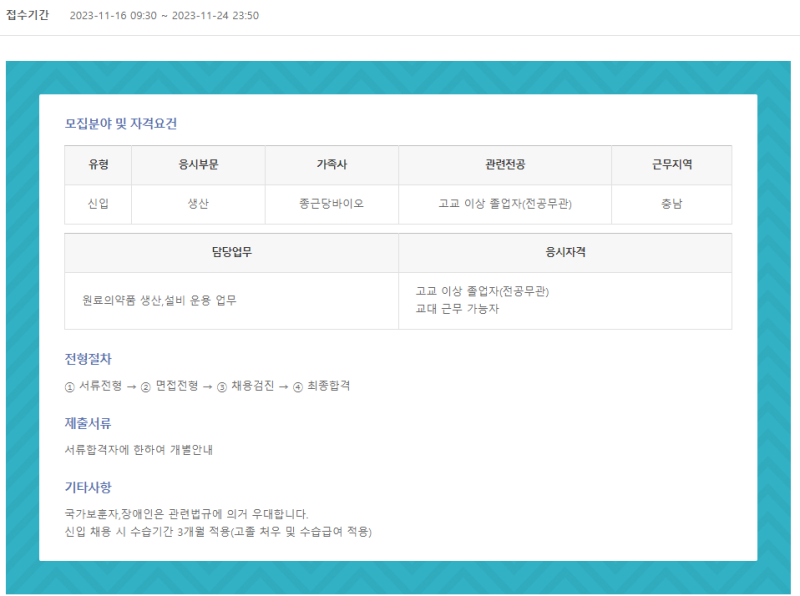 종근당바이오 생산직 핵심 업무