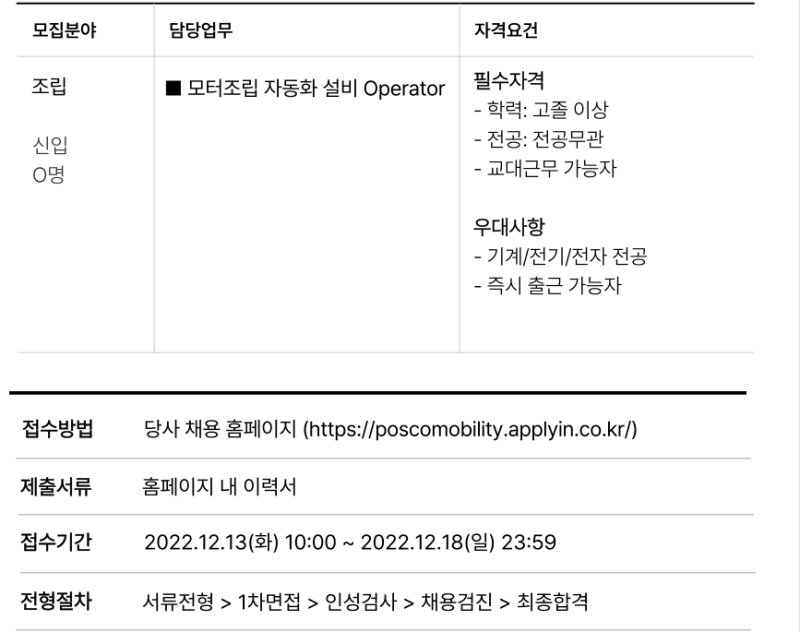 포스코모빌리티솔루션은 자동차 부품, 특히 친환경차 부품을 생산하는 기업입니다. 최근 전기차 시장의 성장과 함께 더욱 주목받고 있으며, 지속적인 성장 가능성이 높은 회사입니다. 채용 방향은 숙련된 기술력을 바탕으로 생산 효율성을 높이고, 미래 모빌리티 산업을 선도할 인재를 찾는 데 집중하고 있습니다.